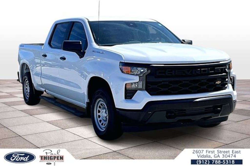 Vidalia Ford Lincoln 2607 E 1st St Vidalia, Georgia 30474 912-788-5318 Preferred Equipment Group 1WT (3.5" Monochromatic Display Driver Info Center, Black (Semi-Gloss) Front Bumper, Black (Semi-Gloss) Rear Bumper, Black Manual Outside Mirrors, Bluetooth® For Phone, Electrical Steering Column Lock, Front Frame-Mounted Black Recovery Hooks, HD Rear Vision Camera, Inside Rear-View Mirror w/Tilt, Locking Tailgate, Manual Tailgate Function w/No EZ Lift, Manual Tilt Wheel Steering Column, Power Front Windows w/Driver Express Up/Down, Power Front Windows w/Passenger Express Down, Power Rear Windows w/Express Down, Rear 60/40 Folding Bench Seat (Folds Up), Remote Keyless Entry, Rubberized-Vinyl Floor Covering, Solar Absorbing Tinted Glass, and Standard Tailgate), Trailering Package (Hitch Guidance), WT Convenience Package (Deep-Tinted Glass, Electric Rear-Window Defogger, Electronic Cruise Control, and Heated Power-Adjustable Outside Mirrors), WT Value Package, Standard Suspension Package, Ford Blue Advantage: Blue Certified Certified, 4D Crew Cab, 2.7L Turbo, 8-Speed Automatic, 4WD, 4-Wheel Disc Brakes, 40/20/40 Front Split-Bench Seat, 6-Speaker Audio System, ABS brakes, Apple CarPlay/Android Auto, Auto High-beam Headlights, Auto-Locking Rear Differential, Automatic Emergency Braking, Brake assist, Delay-off headlights, Electronic Stability Control, Following Distance Indicator, Forward Collision Alert, Front Center Armrest w/Storage, Front Pedestrian Braking, Fully automatic headlights, Illuminated entry, Lane Keep Assist w/Lane Departure Warning, Low tire pressure warning, Outside temperature display, Overhead console, Panic alarm, Power steering, Power windows, Premium audio system: Chevrolet Infotainment 3, Radio data system, Radio: Chevrolet Infotainment 3 System, Remote keyless entry, Speed-sensing steering, Split folding rear seat, Tilt steering wheel, Traction control, Trip computer, Variably intermittent wipers, Vinyl Seat Trim, Wheels: 17" x 8" Ultra Silver Painted Steel, 220 Amp Alternator, 3.42 Rear Axle Ratio, 6 Speakers, Air Conditioning, AM/FM radio, Driver door bin, Dual front impact airbags, Dual front side impact airbags, Front anti-roll bar, Front reading lights, Front wheel independent suspension, IntelliBeam Automatic High Beam On/Off, Not Equipped w/Steering Column Lock, Occupant sensing airbag, Overhead airbag, Passenger door bin, Passenger vanity mirror, Rear reading lights, Rear step bumper, Tachometer, and Voltmeter. Summit White 2022 Chevrolet Silverado 1500 WT 4WD 4WD 2.7L Turbo **LOCAL TRADE**, 7" Color Touchscreen, Android Auto, Apple Carplay, Auto Emergency Braking, Backup Camera, Bluetooth w/ Streaming Audio, Following Distance Indicator, Forward Collision Alert, Forward Pedestrian Braking, Hill Start Assist, Lane Change Alert, Lane Departure System, Preferred Equipment Package, Push Button Start, Tow Package, Trailer Package, 4D Crew Cab, 2.7L Turbo, 8-Speed Automatic, 4WD, 3.5" Monochromatic Display Driver Info Center, 4-Wheel Disc Brakes, 40/20/40 Front Split-Bench Seat, 6-Speaker Audio System, ABS brakes, Apple CarPlay/Android Auto, Auto High-beam Headlights, Auto-Locking Rear Differential, Automatic Emergency Braking, Black (Semi-Gloss) Front Bumper, Black (Semi-Gloss) Rear Bumper, Black Manual Outside Mirrors, Bluetooth® For Phone, Brake assist, Deep-Tinted Glass, Delay-off headlights, Electric Rear-Window Defogger, Electrical Steering Column Lock, Electronic Cruise Control, Electronic Stability Control, Following Distance Indicator, Forward Collision Alert, Front Center Armrest w/Storage, Front Frame-Mounted Black Recovery Hooks, Front Pedestrian Braking, Fully automatic headlights, HD Rear Vision Camera, Heated Power-Adjustable Outside Mirrors, Hitch Guidance, Illuminated entry, Inside Rear-View Mirror w/Tilt, Lane Keep Assist w/Lane Departure Warning, Locking Tailgate, Low tire pressure warning, Manual Tailgate Function w/No EZ Lift, Manual Tilt Wheel