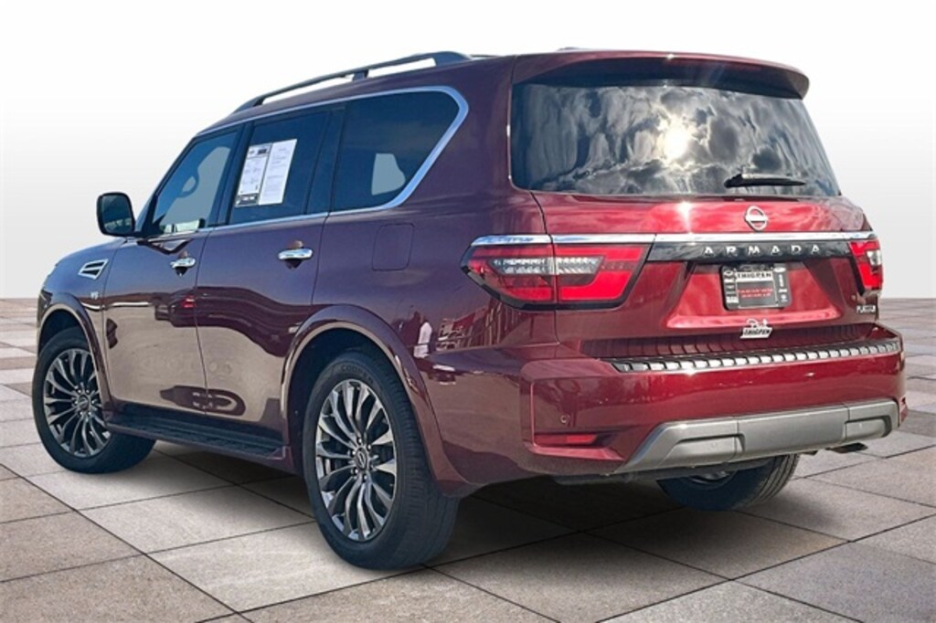 Coulis Red Pearl 2021 Nissan Armada Platinum RWD 5.6L V8 DOHC 32V LEV3-ULEV125 400hp **LOCAL TRADE**, 12.3" HD Color Driver Cluster, 360-Degree Camera, 3rd Row Seating, Android Auto, Apple Carplay, Auto Emergency Braking, Auto LED Headlights, Backup Camera, Blind Spot Monitoring, Bluetooth w/ Streaming Audio, Bose High End Sound Package, Driver Attention Warning, DVD Entertainment Package, Forward Collision Alert, Forward Pedestrian Braking, Front & Rear Park Assist, Hill Start Assist, Lane Departure System, Lane Keeping System, Leather Seats, LED Fog Lights, Memory Package, Multi Zone Climate Control, Parking Sensors, Power Mirror Package, Power Package, Premium Audio Package, Premium Sound Package, Push Button Start, Rear Climate Package, Rear Cross Traffic Alert, Remote Start, Reverse Brake Assist, Reverse Sensing, Safety Package, Sunroof/Moonroof, Tow Package, Traffic Sign Recognition, Trailer Package, WiFi Hotspot Capable, Wireless Charging, 4D Sport Utility, 5.6L V8 DOHC 32V LEV3-ULEV125 400hp, 7-Speed Automatic, RWD, 13 Speakers, 2nd Row Captain's Chairs, 2nd Row Center Console w/Padded Armrest, 3rd Row Carpeted Floor Mats - Captain Seat, 4-Wheel Disc Brakes, A/V remote, ABS brakes, AM/FM radio: SiriusXM, Auto High-beam Headlights, Auto tilt-away steering wheel, Auto-dimming door mirrors, Auto-dimming Rear-View mirror, Auto-leveling suspension, Automatic temperature control, Brake assist, Captain's Chairs Package, Climate-Controlled Front Bucket Seats, Cross Bars, Delay-off headlights, Electronic Stability Control, Emergency communication system: NissanConnect Services, Exterior Parking Camera Rear, Four wheel independent suspension, Front Bucket Seats, Front Center Armrest, Front dual zone A/C, Front fog lights, Fully automatic headlights, Garage door transmitter: HomeLink, Headphones, Heated door mirrors, Heated front seats, Heated steering wheel, Illuminated entry, Illuminated Kick Plates, Illuminated Scuff Plate, Leather Shift Knob, Low tire pressure warning, Memory seat, Navigation System, NissanConnect featuring Apple CarPlay and Android Auto, Outside temperature display, Overhead console, Panic alarm, Power door mirrors, Power Liftgate, Power moonroof, Power passenger seat, Quilted Leather Seat Trim, Radio: NissanConnect w/SiriusXM, Rain sensing wipers, Rear air conditioning, Rear seat center armrest, Rear window wiper, Reclining 3rd row seat, Remote keyless entry, Security system, Speed control, Speed-sensing steering, Speed-Sensitive Wipers, Split folding rear seat, Spoiler, Steering wheel memory, Steering wheel mounted audio controls, Telescoping steering wheel, Tilt steering wheel, Traction control, Trip computer, Turn signal indicator mirrors, Ventilated front seats, Welcome Lighting, Wheels: 22" Machine-Faced w/Tinted Clear Coat.