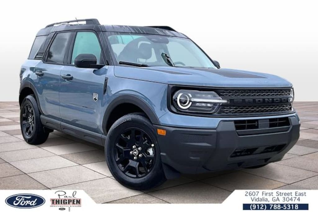 Azure Gray Metallic Tri-Coat 2025 Ford Bronco Sport Big Bend 4WD 8-Speed Automatic 1.5L EcoBoost Vidalia Ford Lincoln 2607 E 1st St Vidalia, Georgia 30474 912-788-5318 Black Appearance Package (Carbon Black Grille w/Black BRONCO Lettering, Cargo Mat, Front & Rear Floor Liners w/o Carpet Mats, Front Driver/Passenger Seat Back Map Pockets, Liftgate w/Black BRONCO SPORT Lettering, Painted Shadow Black Roof, Premium Trimmed Htd Fr Sport Contour Bucket Seats, and Wheels: 17" Matte Black-Painted Aluminum), Equipment Group 200A, 4D Sport Utility, 1.5L EcoBoost, 8-Speed Automatic, 4WD, 4-Wheel Disc Brakes, 6 Speakers, ABS brakes, Air Conditioning, Alloy wheels, AM/FM radio: SiriusXM, AM/FM Stereo, Auto High-beam Headlights, Automatic temperature control, Brake assist, Cloth w/Easy-to-Clean Front Bucket Seats, Compass, Delay-off headlights, Driver door bin, Driver vanity mirror, Dual front impact airbags, Dual front side impact airbags, Electronic Stability Control, Emergency communication system: SYNC 4 911 Assist, Four wheel independent suspension, Front anti-roll bar, Front Bucket Seats, Front Center Armrest, Front reading lights, Fully automatic headlights, Heated door mirrors, Illuminated entry, Knee airbag, Low tire pressure warning, Occupant sensing airbag, Outside temperature display, Overhead airbag, Overhead console, Panic alarm, Passenger door bin, Passenger vanity mirror, Power door mirrors, Power steering, Power windows, Radio data system, Rear anti-roll bar, Rear Parking Sensors, Rear reading lights, Rear seat center armrest, Rear window defroster, Rear window wiper, Remote keyless entry, Security system, SiriusXM, Speed control, Speed-sensing steering, Speed-Sensitive Wipers, Split folding rear seat, Steering wheel mounted audio controls, SYNC 4 w/Enhanced Voice Recognition, Tachometer, Telescoping steering wheel, Tilt steering wheel, Traction control, Trip computer, Variably intermittent wipers, and Wheels: 17" Carbonized Gray-Painted Aluminum. 13.2" HD Color Touchscreen, Auto LED Headlights, Backup Camera, Off Road Package, 4D Sport Utility, 1.5L EcoBoost, 8-Speed Automatic, 4WD, Black Appearance Package, Carbon Black Grille w/Black BRONCO Lettering, Cargo Mat, Equipment Group 200A, Front & Rear Floor Liners w/o Carpet Mats, Front Driver/Passenger Seat Back Map Pockets, Liftgate w/Black BRONCO SPORT Lettering, Painted Shadow Black Roof, Premium Trimmed Htd Fr Sport Contour Bucket Seats, Wheels: 17" Matte Black-Painted Aluminum. Price includes: $2000 - Retail Customer Cash. Exp. 03/31/2026