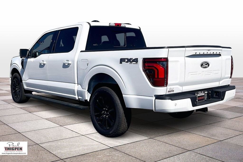 Star White Metallic Tri-Coat 2025 Ford F-150 Platinum 4WD 10-Speed Automatic 3.5L V6 EcoBoost 4WD, 4-Wheel Disc Brakes, 4x4 FX4 Off-Road Bodyside Decal, 8 Speakers, ABS brakes, Adjustable pedals, Air Conditioning, Alloy wheels, AM/FM radio: SiriusXM with 360L, Auto High-beam Headlights, Auto tilt-away steering wheel, Auto-dimming door mirrors, Auto-dimming Rear-View mirror, Automatic temperature control, Brake assist, Bumpers: body-color, Compass, Delay-off headlights, Driver door bin, Driver vanity mirror, Dual front impact airbags, Dual front side impact airbags, Electronic Locking w/3.55 Axle Ratio, Electronic Stability Control, Emergency communication system: SYNC 4 911 Assist, Equipment Group 702A High, Front anti-roll bar, Front Bucket Seats, Front Center Armrest, Front dual zone A/C, Front fog lights, Front reading lights, Front wheel independent suspension, Fully automatic headlights, FX4 Off-Road Package, Garage door transmitter, Heads-Up Display, Heated door mirrors, Heated front seats, Heated rear seats, Heated steering wheel, Hill Descent Control, Illuminated entry, Internet access capable: FordPass Connect 5G, Leather steering wheel, Low tire pressure warning, Memory seat, Monotube Rear Shocks, Navigation system: Connected Navigation, Occupant sensing airbag, Off-Road Tuned Front Shock Absorbers, Outside temperature display, Overhead airbag, Overhead console, Panic alarm, Passenger door bin, Passenger vanity mirror, Pedal memory, Power door mirrors, Power driver seat, Power passenger seat, Power steering, Power windows, Radio data system, Radio: B&O Sound System by Bang & Olufsen, Radio: B&O Unleashed Sound System by Bang & Olufsen, Rain sensing wipers, Rear reading lights, Rear seat center armrest, Rear step bumper, Rear window defroster, Remote keyless entry, Rock Crawl Mode, Security system, Speed control, Split folding rear seat, Steering wheel memory, Steering wheel mounted audio controls, SYNC 4 w/Enhanced Voice Recognition, Tachometer, Telescoping steering wheel, Tilt steering wheel, Tough Bed Spray-In Bedliner, Traction control, Tray Style Floor Liner, Trip computer, Turn signal indicator mirrors, Twin Panel Moonroof, Unique Multi-Contour Leather Bucket Seats, Variably intermittent wipers, Ventilated front seats, Voltmeter, Wheels: 20" Painted Gloss Ebony Black, 4WD.