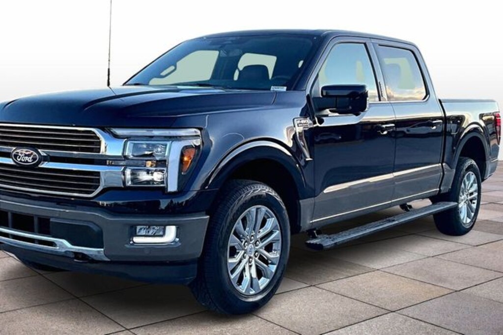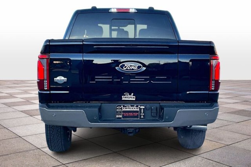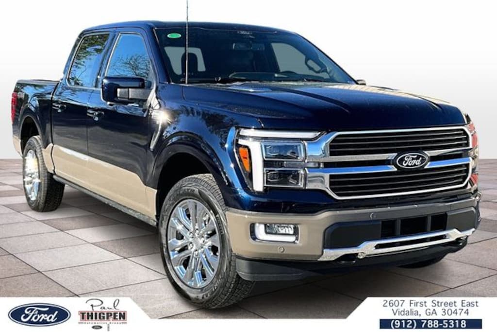Blue 2026 Ford F-150 King Ranch 4WD 10-Speed Automatic 3.5L V6 EcoBoost Vidalia Ford Lincoln 2607 E 1st St Vidalia, Georgia 30474 912-788-5318 Ford Connectivity Package (1-Year Included), GVWR: 7,400 lbs Payload Package, Internet access capable: 5G Modem - Ford Connectivity Package, 4WD, 4-Wheel Disc Brakes, 8 Speakers, ABS brakes, Adjustable pedals, Air Conditioning, Alloy wheels, AM/FM radio: SiriusXM with 360L, Auto High-beam Headlights, Auto tilt-away steering wheel, Auto-dimming door mirrors, Auto-dimming Rear-View mirror, Automatic temperature control, Brake assist, Chrome wheels, Compass, Delay-off headlights, Driver door bin, Driver vanity mirror, Dual front impact airbags, Dual front side impact airbags, Electronic Locking with 3.55 Axle Ratio, Electronic Stability Control, Emergency communication system: SYNC 4 911 Assist, Front anti-roll bar, Front Bucket Seats, Front Center Armrest, Front dual zone A/C, Front fog lights, Front reading lights, Front wheel independent suspension, Fully automatic headlights, Garage door transmitter, Genuine wood dashboard insert, Heated door mirrors, Heated front seats, Heated rear seats, Heated steering wheel, Illuminated entry, Leather steering wheel, Low tire pressure warning, Memory seat, Navigation system: Connected Navigation, Occupant sensing airbag, Outside temperature display, Overhead airbag, Overhead console, Panic alarm, Passenger door bin, Passenger vanity mirror, Pedal memory, Power door mirrors, Power driver seat, Power passenger seat, Power steering, Power windows, Radio data system, Radio: B&O Sound System by Bang and Olufsen, Rain sensing wipers, Rear reading lights, Rear seat center armrest, Rear step bumper, Rear window defroster, Remote keyless entry, Security system, Speed control, Split folding rear seat, Steering wheel memory, Steering wheel mounted audio controls, SYNC 4 with Enhanced Voice Recognition, Tachometer, Telescoping steering wheel, Tilt steering wheel, Traction control, Trip computer, Turn signal indicator mirrors, Variably intermittent wipers, Ventilated front seats, and Wheels: 20" Chrome-Like PVD. 4WD.