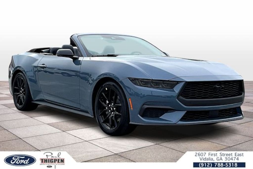 Vapor Blue Metallic 2026 Ford Mustang RWD 10-Speed Automatic EcoBoost 2.3L I4 GTDi DOHC Turbocharged VCT Vidalia Ford Lincoln 2607 E 1st St Vidalia, Georgia 30474 912-788-5318 4-Wheel Disc Brakes, 9 Speakers, ABS brakes, Active Anti-Theft System, Air Conditioning, Alloy wheels, AM/FM radio: SiriusXM with 360L, AM/FM Stereo, Auto High-beam Headlights, Automatic temperature control, Brake assist, Bumpers: body-color, Compass, Convertible roof lining, Delay-off headlights, Driver door bin, Driver vanity mirror, Dual front impact airbags, Dual front side impact airbags, Electronic Stability Control, Emergency communication system: 911 Assist, Exterior Parking Camera Rear, Four wheel independent suspension, Front anti-roll bar, Front Bucket Seats, Front Center Armrest, Front dual zone A/C, Front reading lights, Fully automatic headlights, Glass rear window, Heated front seats, Illuminated entry, Knee airbag, Leather Shift Knob, Low tire pressure warning, Occupant sensing airbag, Outside temperature display, Overhead console, Panic alarm, Passenger door bin, Passenger vanity mirror, Perimeter Alarm, Power convertible roof, Power door mirrors, Power driver seat, Power steering, Power windows, Radio data system, Rain sensing wipers, Rear anti-roll bar, Rear Parking Sensors, Rear window defroster, Remote keyless entry, Security system, Speed control, Speed-sensing steering, Speed-Sensitive Wipers, Sport steering wheel, Steering wheel mounted audio controls, SYNC 4, Tachometer, Telescoping steering wheel, Tilt steering wheel, Traction control, Trip computer, Variably intermittent wipers, Voltmeter, and Wheels: 18" x 8" Painted Shadow Silver Cast Aluminum.